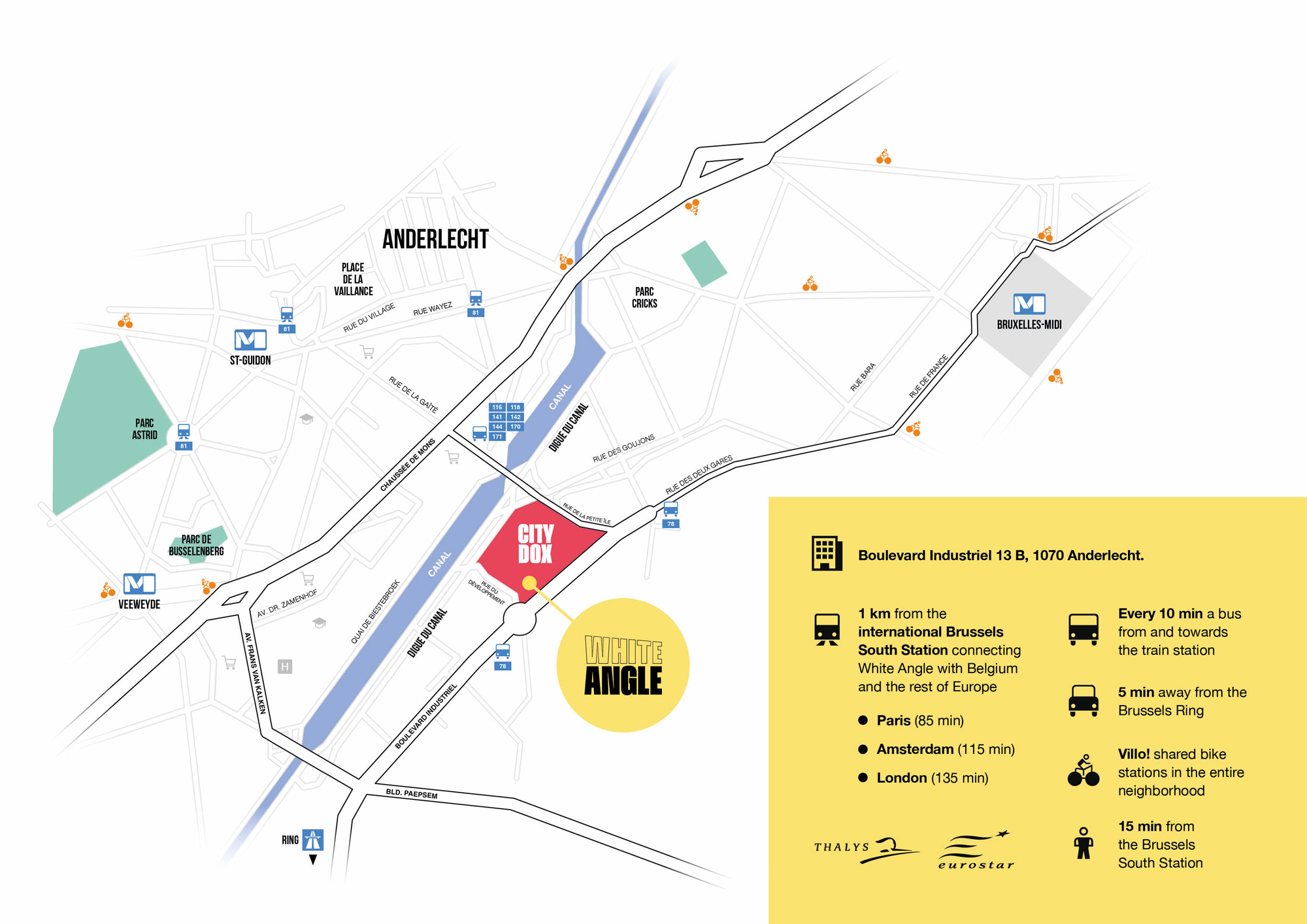 The Saint-Guidon tram and metro station can be reached easily, as it is just 900 metres away on foot. The number 81 tram and the number 5 metro link White Angle with the centre of Brussels in less than 20 minutes.